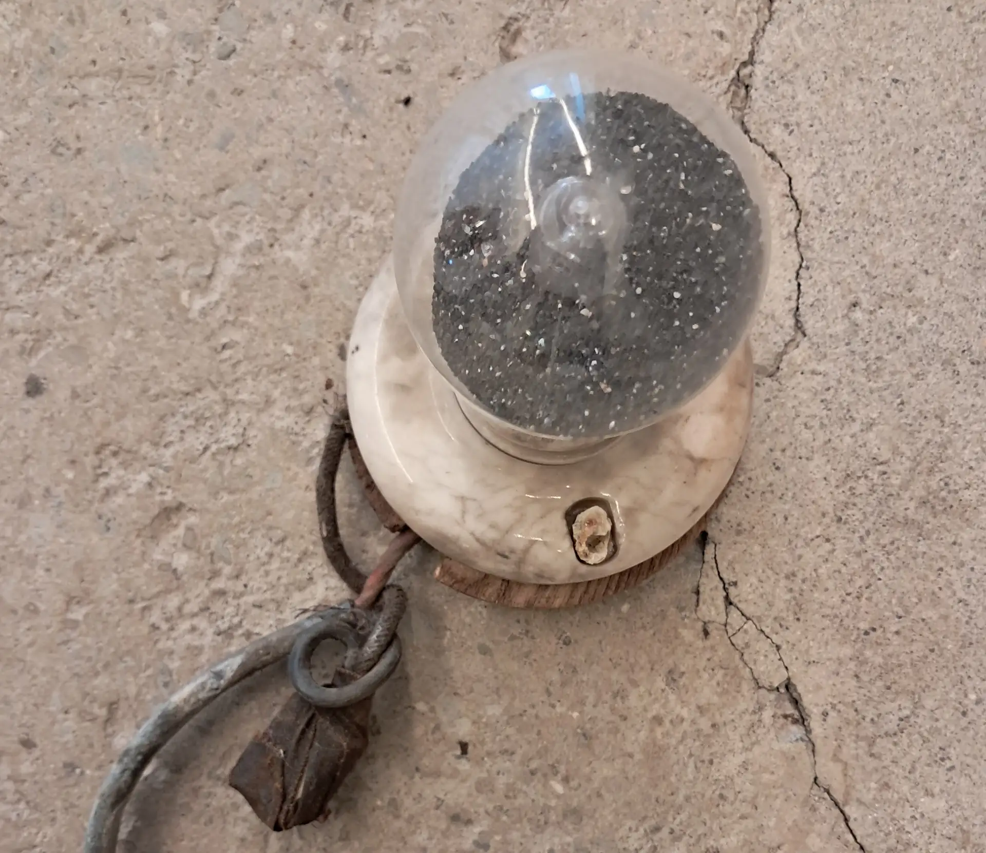 This sense of transformation extends into the exhibition’s sculptural works: sandblasted furnace fragments, artificial pebbles, a light bulb filled with sand. These objects—like the drawings—speak of industry, residue, compression, and touch. They could be read as archaeological, domestic, or speculative, depending on how long one looks.