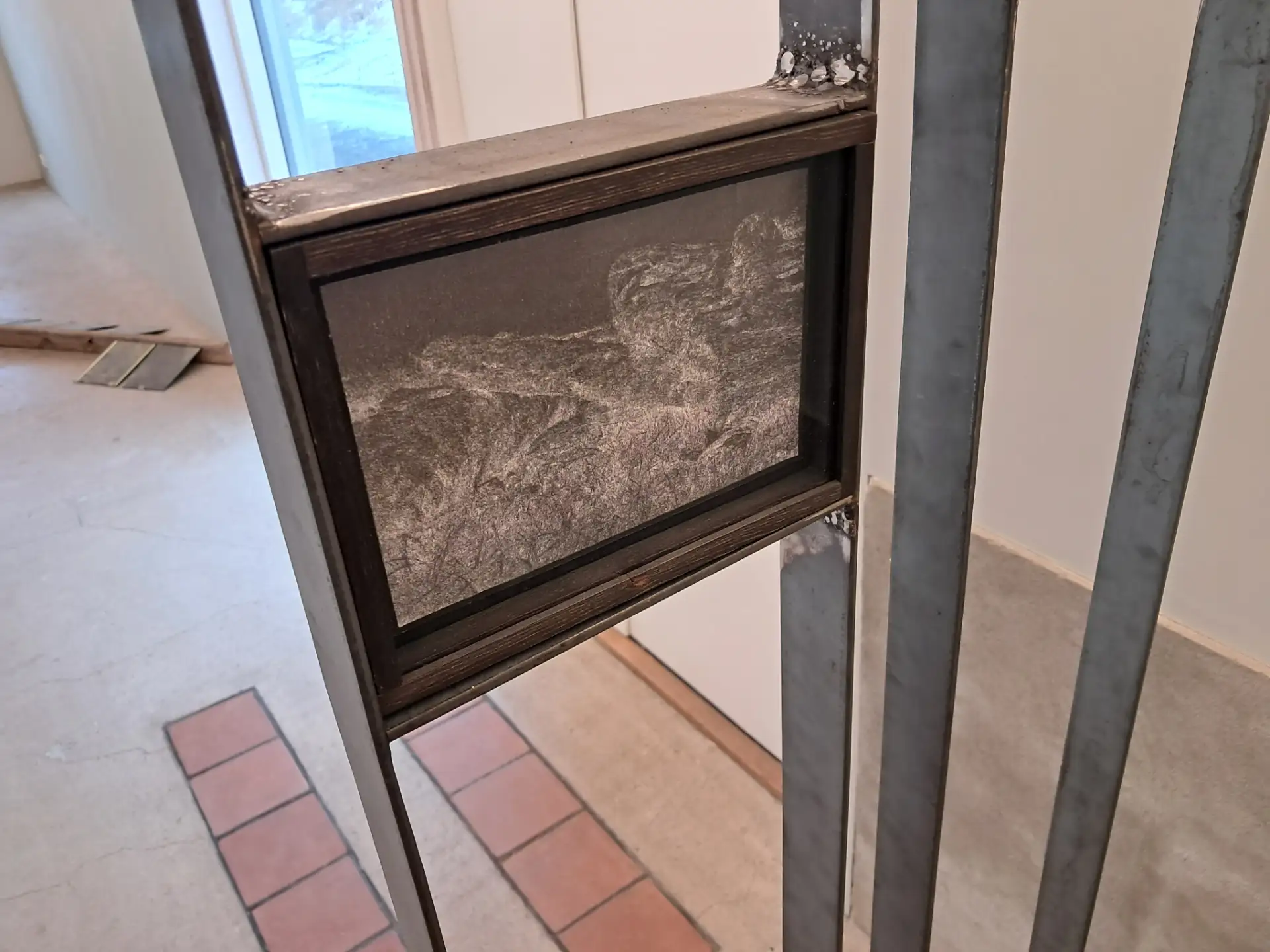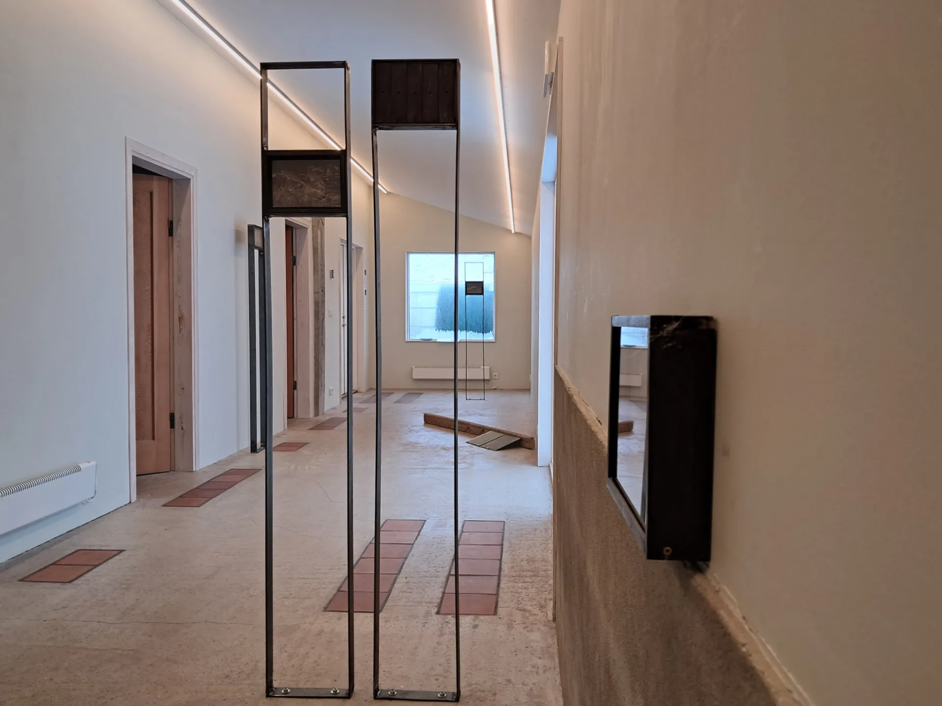 Þessi tilfinning umsköpunar teygir sig inn í þrívíð verk sýningarinnar: sandblásnir ofnhlutar, gervisteinvölur, ljósapera fyllt sandi. Þessi hlutir—líkt og teikningarnar—segja frá iðnaði, leifum, samþjöppun og snertingu. Hægt er að lesa þá sem fornleifar, heimilistæki eða framtíðartilgátu, allt eftir því hve lengi áhorfandinn dvelur við.